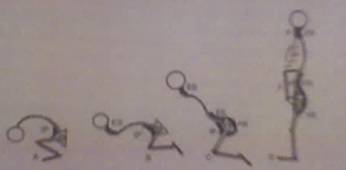 conseguir se movimentar. Para isso as estruturas devem estar equilibradas. 2.3.1 A Formação da Curvatura Lordótica da Coluna Vertebral Segundo Knoplich (2003), a posição ereta do homem só foi possível pelas modificações que surgiram na coluna. A cabeça teve de se equilibrar na porção superior da coluna e, assim, permitir que os olhos pudessem ficar voltados para frente; a cabeça e o tronco tiveram de se equilibrar sobre os membros inferiores, por meio da cintura pélvica; e o corpo todo teve de se apoiar no espaço ocupado pelas plantas dos pés, com isso modificando o centro de gravidade. Essas manobras só foram possíveis pelo aparecimento das curvas lordóticas secundárias, na região cervical e na lombossacra, e nisso desempenhou papel fundamental a massa muscular, por desenvolver uma força antigravitacional poderosa, que permitisse aos primitivos seres antropóides erguer-se do chão, adquirir a postura ereta, mantê-la e andar. Esses atos eram voluntários, comandados pelo sistema nervoso central, e, com o passar dos séculos, transformaram-se em atos regulados pelo sistema nervoso involuntário e pelo sistema fuso muscular; ou sistema gama (Cailliet, 1988). O feto da espécie humana encontra-se, no útero, numa posição de flexão total, com a coluna em “C” cifótica. O único músculo de inervação voluntário que está em atividade é o ílio-psoas, que permite ao feto dar pontapés. Este, porém, não pode dar cabeçadas. Na vida pós-natal, a criança consegue, logo nas primeiras semanas, levantar a cabeça, o que é feito pela presença da musculatura antigravitacional do pescoço e resulta na formação da lordose cervical. Durante os dois primeiros anos de vida, as vértebras lombares crescem rapidamente, com conseqüente alongamento lombar e aumento das nádegas, resultantes da posição ereta (Ascher, 1976). A adição das duas curvaturas lordóticas representa primariamente o efeito antigravitário dos músculos eretores que se desenvolvem na criança quando tenta e finalmente consegue adquirir a postura ereta em pé. As curvas lordóticas originam-se da força dos músculos antigravitacionaise a fraqueza da musculatura oposta, tal como os abdominais e os flexores do pescoço (Caillet, 1988). Figura 1 - Evolução Cronológica da Coluna Vertebral com Adição das Curvaturas Lordóticas (Knoplich, 2003).