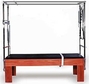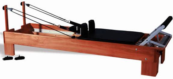 Foi aplicada nesta pesquisa a Escala Comportamental, por ser uma informação fidedigna da realidade diária das participantes. As participantes foram avaliadas antes de iniciar as aulas de Pilates e no final da 8.ª semana de intervenção. O grupo controle passou pela mesma avaliação. A avaliação foi feita individualmente, com a participante tendo a posse da escala nas mãos, com o tempo livre para análise e em seguida responder. A pesquisa foi realizada em uma clínica de fisioterapia particular em Cuiabá – MT. Os materiais utilizados pertenciam a esta clínica e foram todos cedidos no período da intervenção. Os materiais utilizados foram os equipamentos criados por Joseph Pilates e são apropriados para execução do método (Figuras 5, 6, 7, 8 e 9). Figura 5 – Reformer (Becker, 2003).