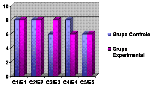 Com os dados adquiridos através do pré-teste e o reteste, foi feita a análise, de forma quantitativa, verificando o nível da dor lombar baseada na Escala Comportamental e então, feita a comparação do Grupo Controle e o Grupo Experimental. Para melhor apresentação dos dados, as participantes do Grupo Controle foram denominadas C1, C2, C3, C4 e C5 e as participantes do Grupo Experimental, E1, E2, E3, E4 e E5. Os dados foram representados em gráficos e tabelas, facilitando a compreensão. No Grupo Controle foi realizado um pré-teste, através da Escala Comportamental da dor, segundo Serrano (2003), sendo que 60% tiveram a nota oito, apresentando dor que não é esquecida e atrapalha todas as atividades da vida diária, exceto alimentação e higiene e 40% tiveram a nota seis, apresentando dor que não é esquecida, mas não impede de exercer atividades da vida diária. Esses resultados seguem melhor apresentados na Tabela 1 e no Gráfico 1. Tabela 2 - Resultados do Pré-teste no Grupo Controle.